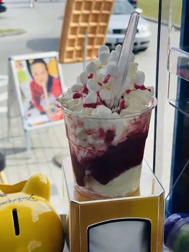 “Opinie są skrajnie podzielone: jedna klientka wystawiła 5/5 za bardzo przystojnego sprzedawcę, druga dała 1/5 za bezczelną obsługę młodej dziewczyny. Główna krytyka dotyczy niskiej jakości lodów śmietankowych, niezgodności z menu oraz braku paragonu.”